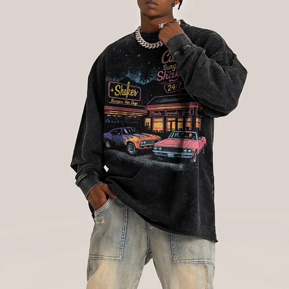 Muscle Cars Pattern Deep Washed Vintage Long Sleeves T-Shirt